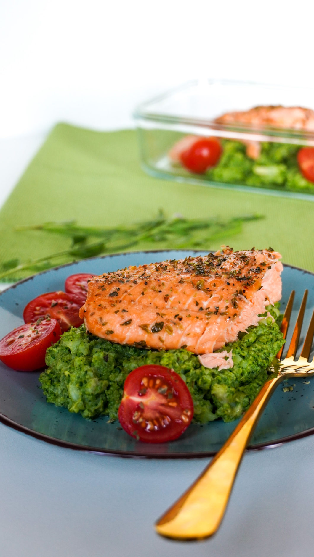 Ofenlachs mit Tomaten und Brokkoli-Cashew Mash