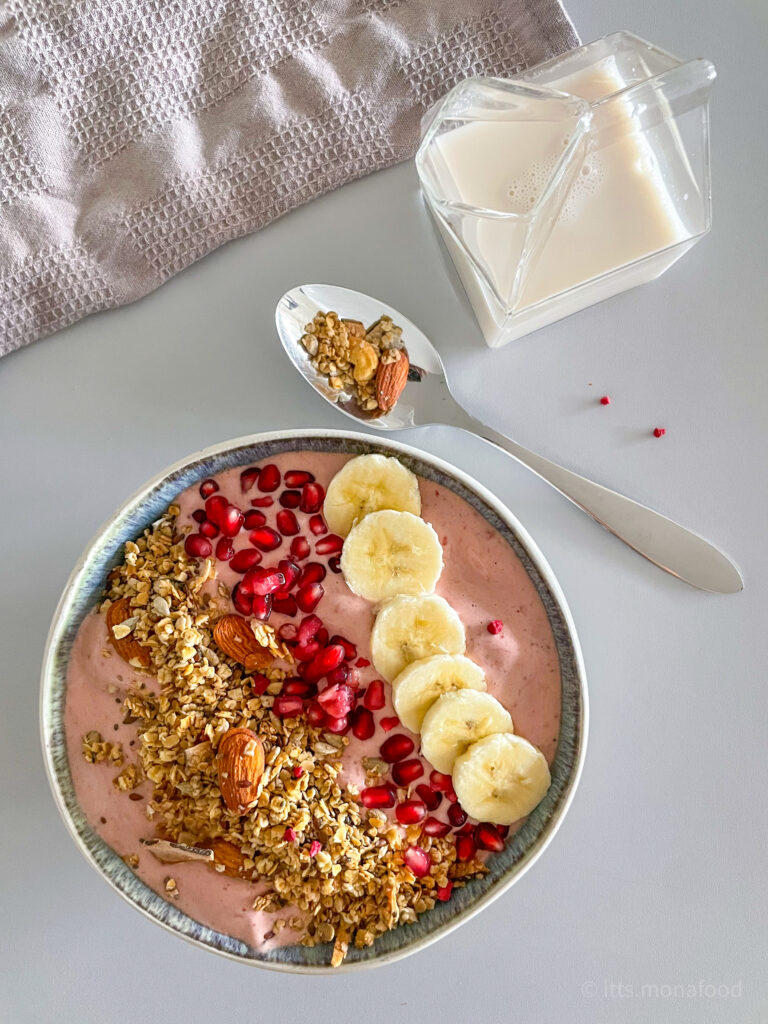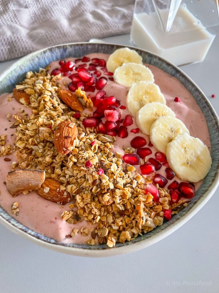 Die Bowl ist nicht nur lecker, sondern auch reich an Vitaminen und Antioxidantien – ideal für einen energiereichen Start in den Tag. Wenn du magst, kannst du 3 Esslöffel Proteinpulver dazu geben. Vanille oder Schokolade passen am besten.