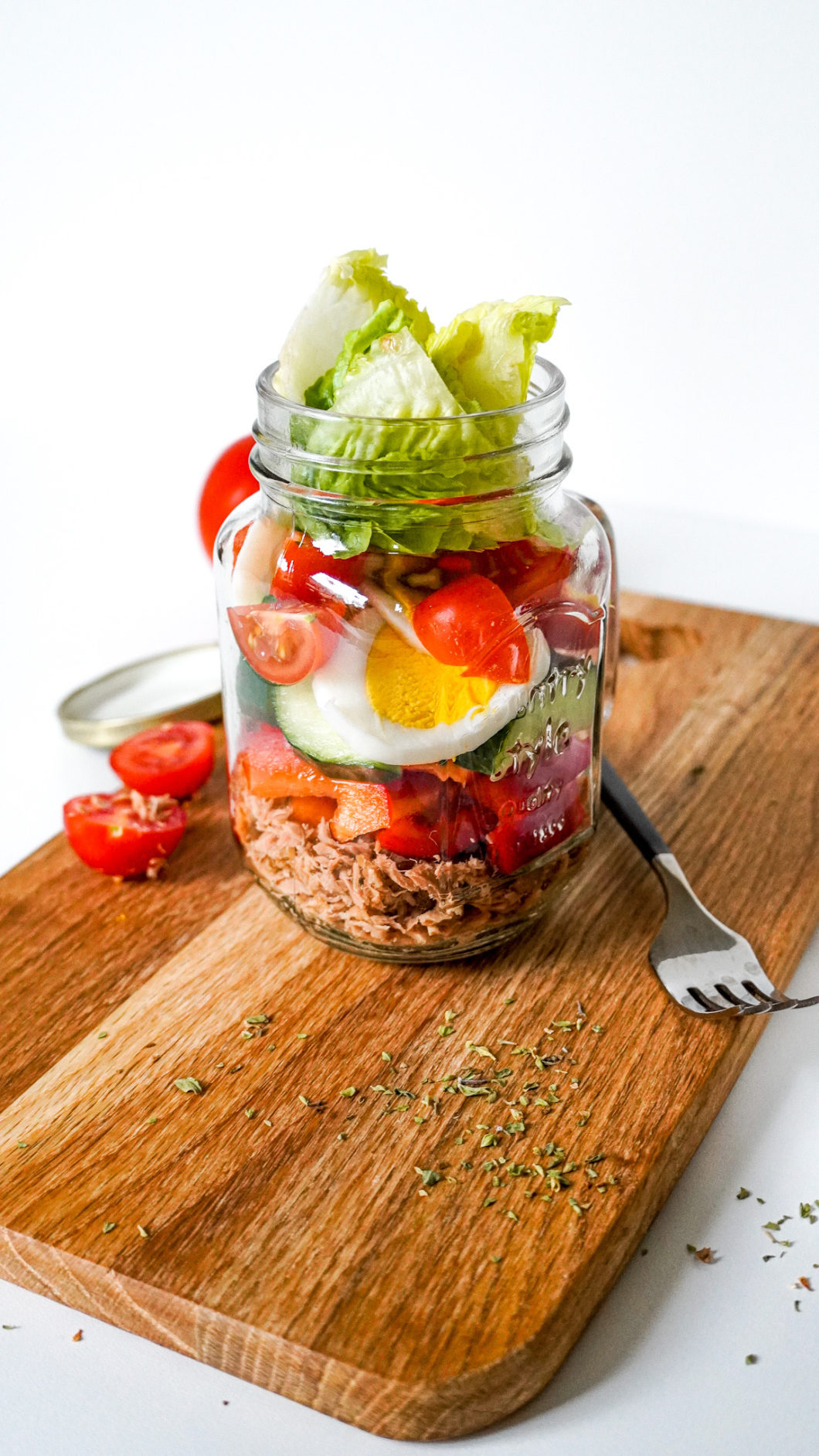 - Thunfisch in einem Sieb abtropfen lassen und anschliessend in die Gläser füllen. Paprika und Gurke waschen, putzen, klein schneiden und auf die Gläser verteilen. Tomaten waschen, vom Strunk befreien, vierteln und in die Gläser füllen.